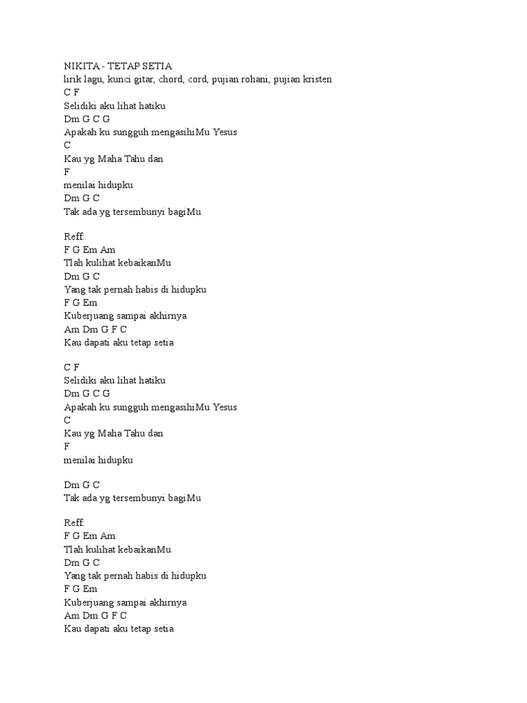 2 responses to kumpulan lirik lagu rohani nikita dan chord lagu rohani nikita sk April 28 2020 at 949 AM Nice information valuable and excellent design as share good stuff with good ideas and concepts lots of great information and inspiration both of which I need thanks to offer such a. Bagi yang mendengarkan lagu ini mohon di klik tombol subscribe klik tombol lonceng. C C Am Dm G C Am Banyak perkara yang tak dapat ku mengerti Dm G C Am D7 Bb G Mengapakah harus terjadi di dalam kehidupan ini C Am Dm G C Am Satu perkara yang ku simpan dalam ha-ti Dm G C Am.